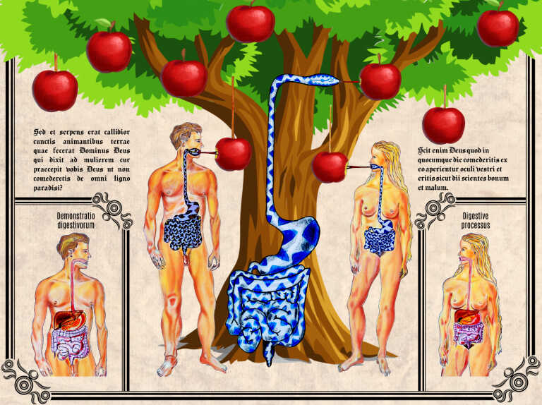 I present the bodies of Adam and Eve as anatomical drawings. The snake form is also found in their bodies. Their oral cavity is the head of the snake, and their esophagus and digestive system form a snake shape.