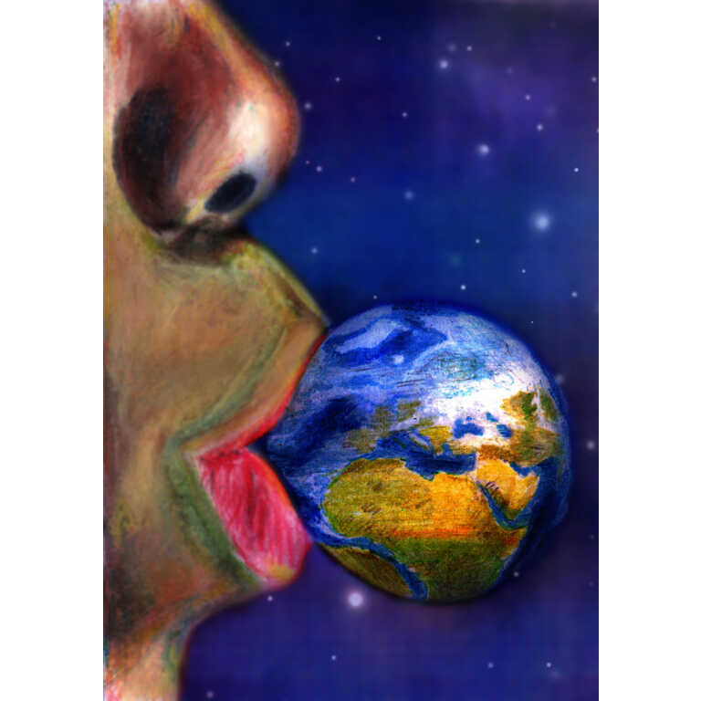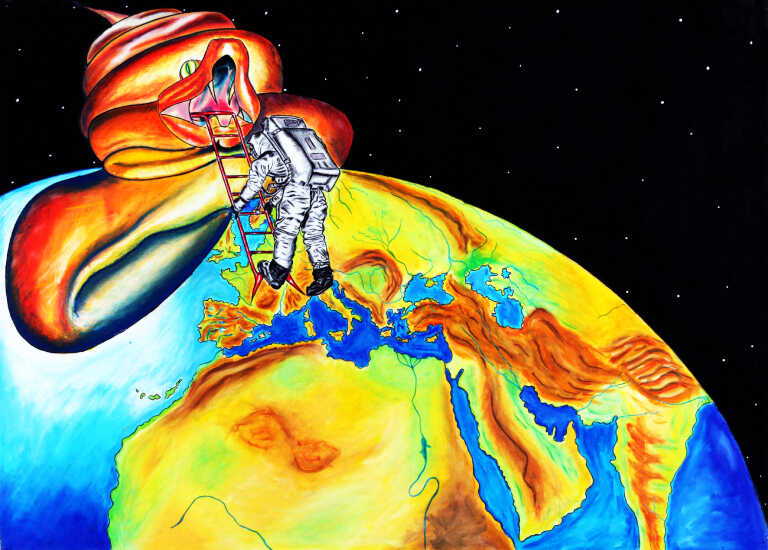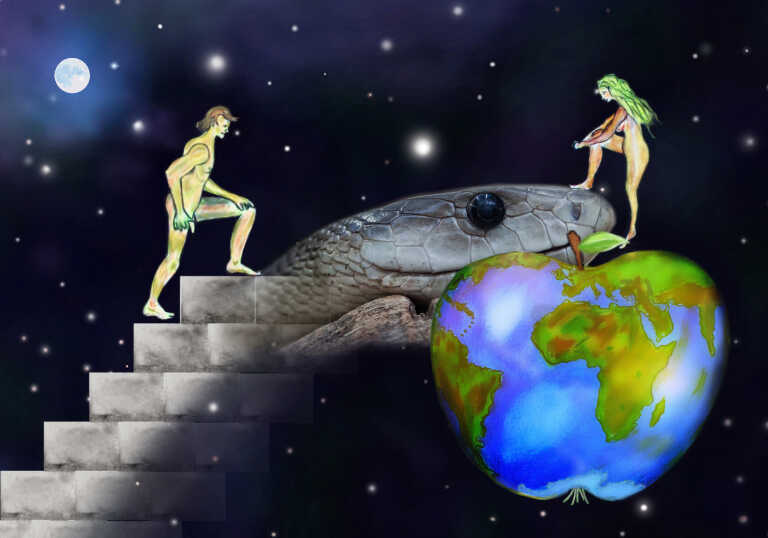We are in outer space. Planet Earth is shown in the shape of the forbidden fruit – the apple. In this picture, too, the snake leads Adam and Eve to the apple so that the couple can climb up to the head of the snake on its stepped back, from where they can easily step onto the Earth. The picture is about the expulsion from Paradise.