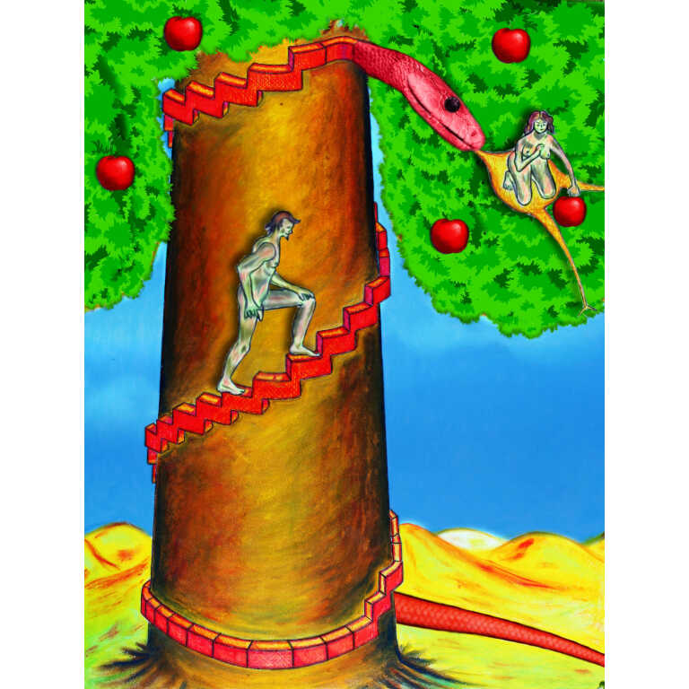 The snake coils itself around the tree that bears the forbidden fruit. The long body of the snake takes the shape of a staircase. In this picture, the snake does not give the forbidden fruit to Eve, but makes the path to the fruit easier for Adam and Eve.