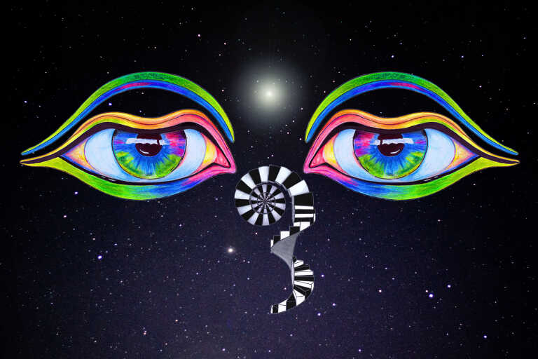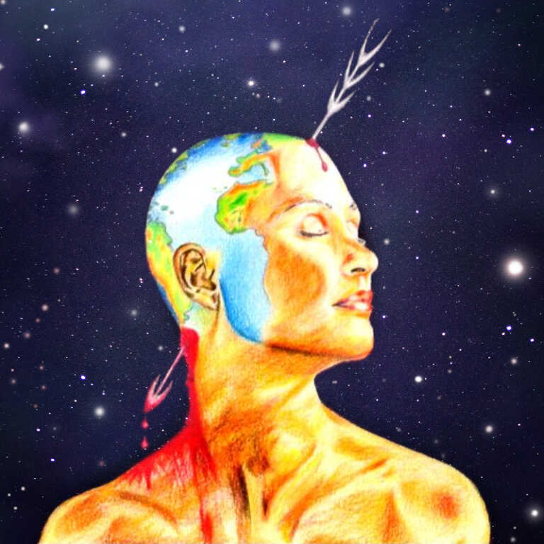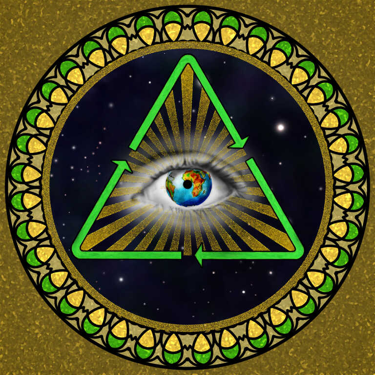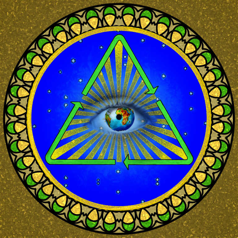The symbol of the Holy Trinity in the Middle Ages was a triangle with an eye in the middle. In my image, the triangle became the symbol of recycling, and the eyeball became the Planet Earth itself.