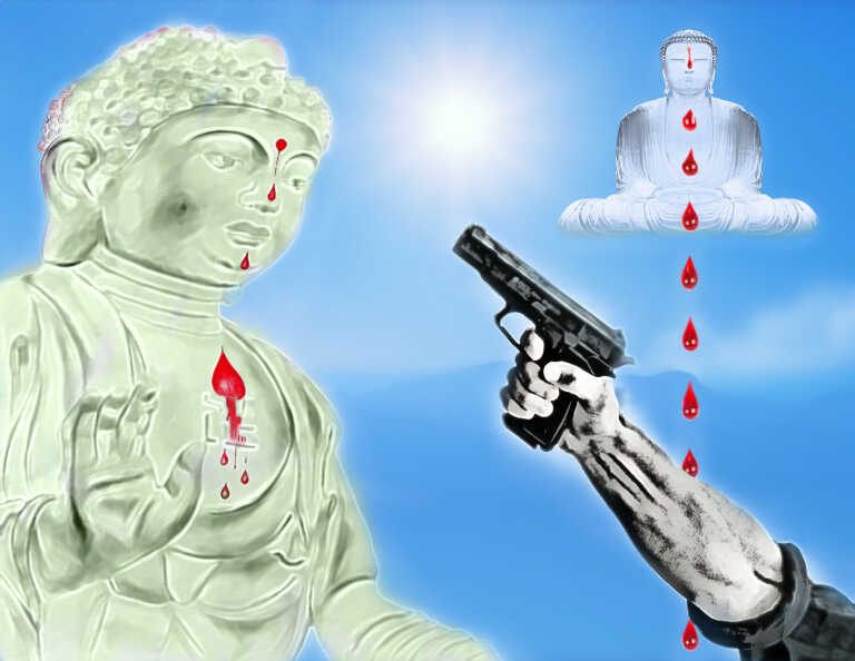 The picture shows the Tian Tan Buddha statue in Hong Kong. An assassin’s hand points a pistol at the statue and shoots at it. The place of the bullet – which is the third eye for Buddhists and the bindi for Hindus – begins to bleed.