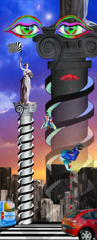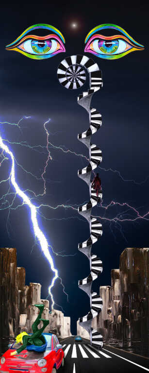 The picture shows an accident. A woman crossing a zebra-crossing is hit by a red car. The pedestrian-crossing turns into a spiral staircase that leads to the sky. Perhaps the woman will also take this step towards heaven. Someone is already going up the stairs. The heavenly gaze is watching.