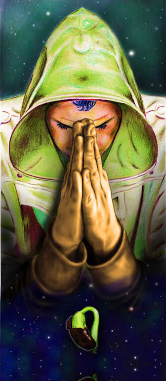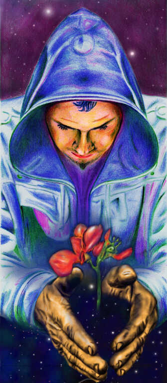 He comes to Earth from the mouth of a huge snake in the form of an astronaut – a man. The snake opens its mouth and sticks out its tongue, which is now – in this picture – a ladder. Man climbs down to Earth on this ladder.