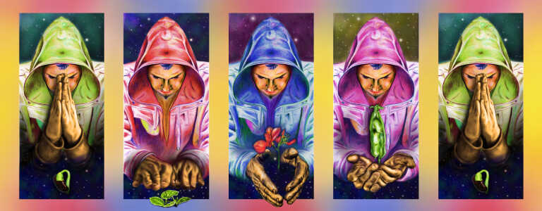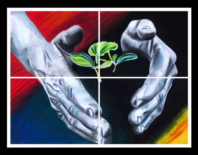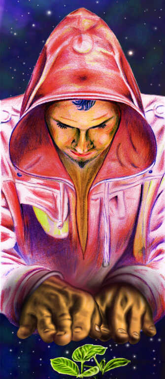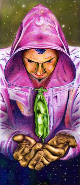 The picture shows one of the elements of the painting A caring look. The bean germinates, then becomes a plant, then a flower, and finally a fruit. And one of the beans in the crop sprouts…
