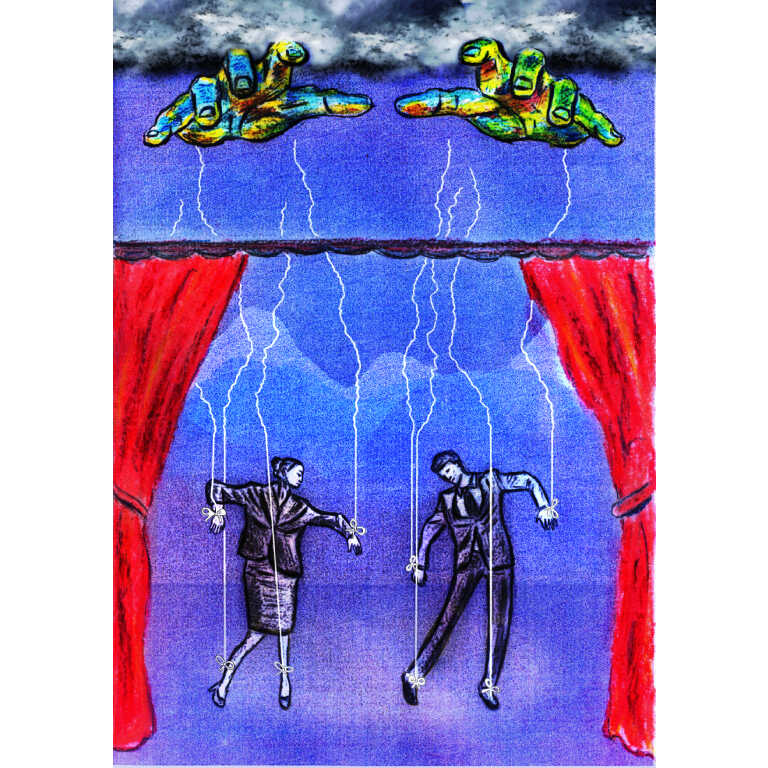 Puppets are not fairy tale characters. But flesh and blood human figures, a man and a woman.