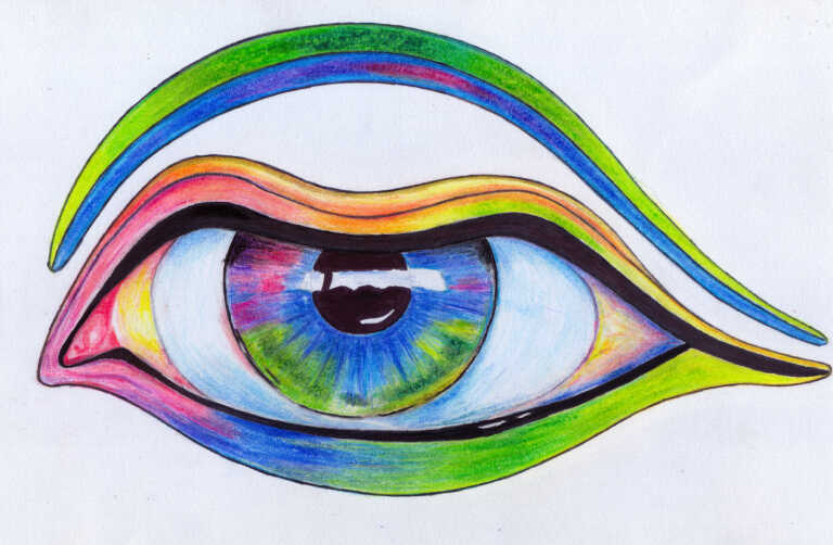 The picture shows an accident. A man crossing a zebra-crossing is hit by a red car. The pedestrian-crossing turns into a spiral-shaped rise that leads to the sky. Perhaps the man will also take this step towards heaven. Someone is already going up the stairs. The heavenly gaze is watching.