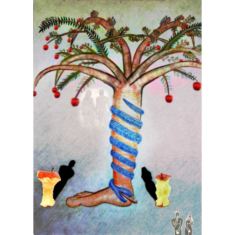 Under the tree are two chewed apples, one chewed apple represents the male body, while the other chewed apple evokes the shape of the female body.